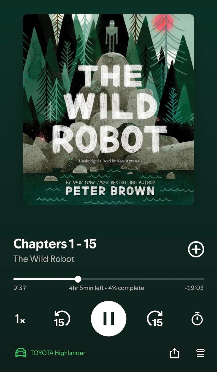We had an hour-plus drive so we started listening to The Wild Robot audiobook. It’s so sweet! We’re about halfway through. After this I really want to watch the movie.